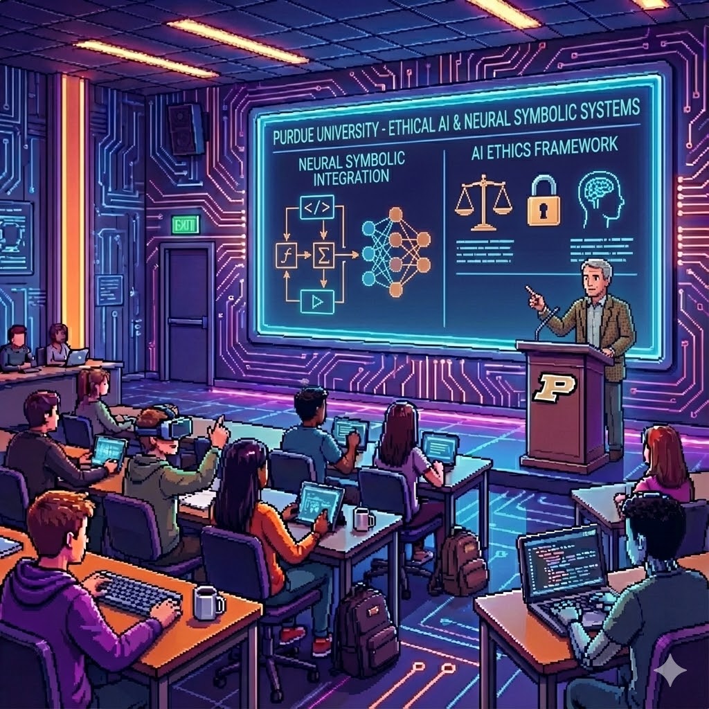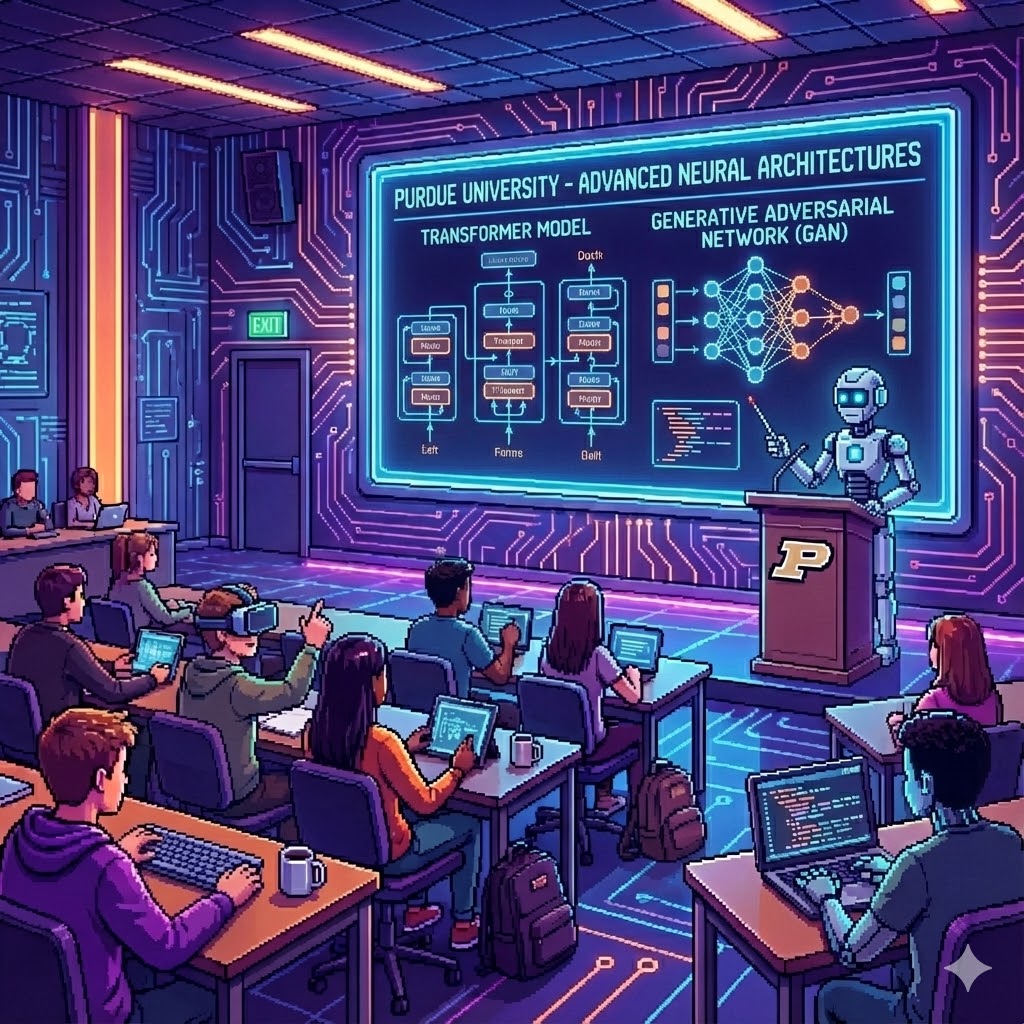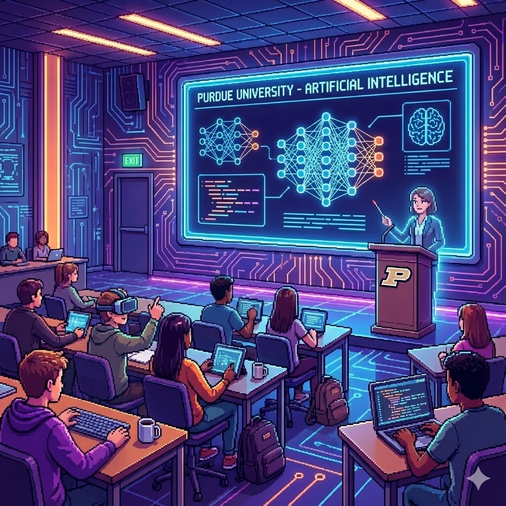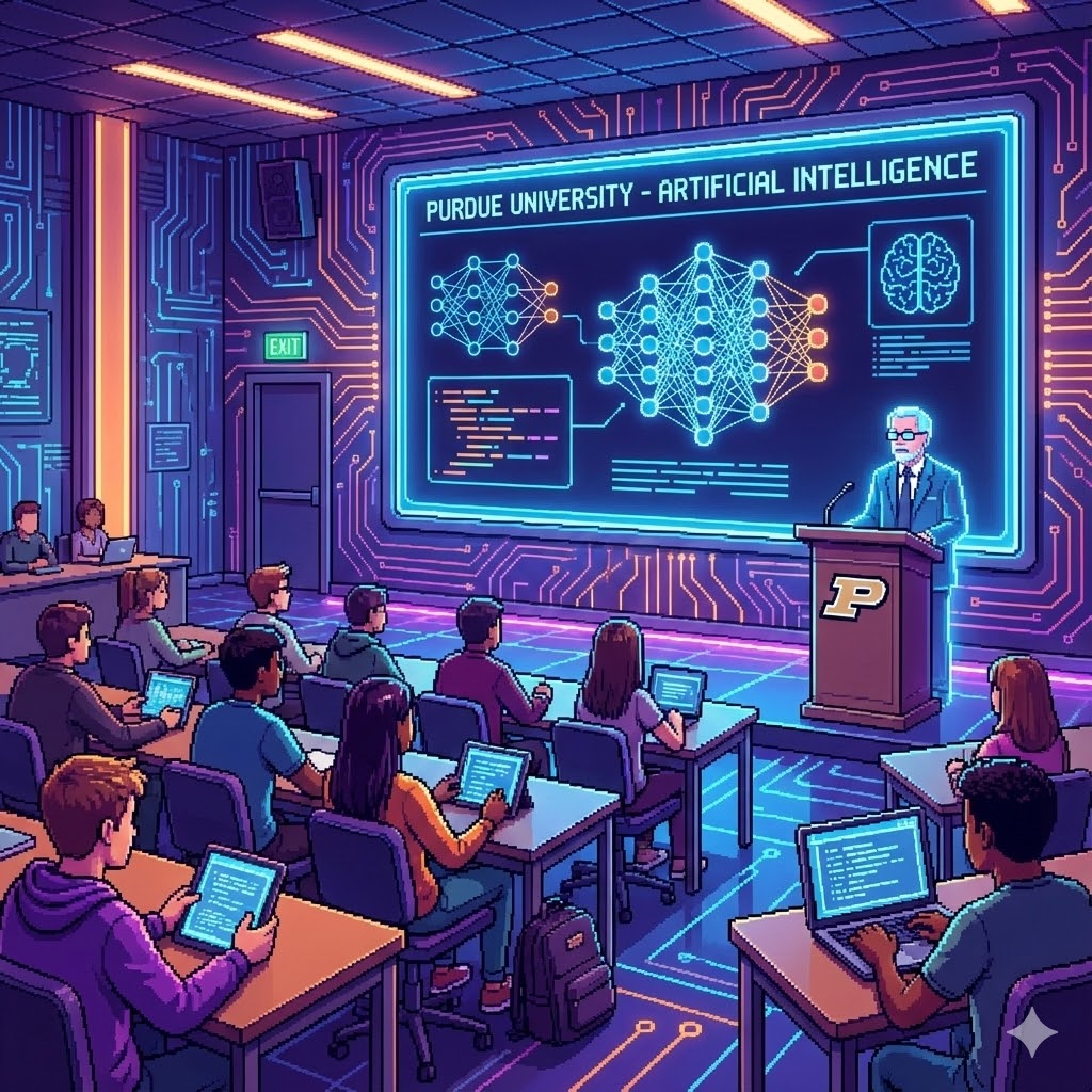 A class on Artificial Intelligence at Purdue University, digital art.